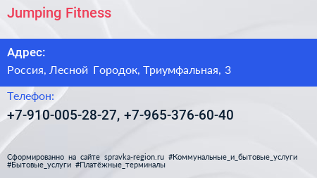 Jumping Fitness по адресу 3, Триумфальная улица, Жилой комплекс «Гусарская баллада», Одинцово, Одинцовский городской округ, Московская область, Центральный федеральный округ, 143002, Россия в дальнейшем Организация, размещена в следующих категориях: