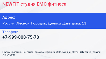 NEWFIT, студия EMC-фитнеса по адресу 11, улица Дениса Давыдова, Жилой комплекс «Гусарская баллада», ВНИИССОК, Одинцовский городской округ, Московская область, Центральный федеральный округ, 143002, Россия в дальнейшем Организация, размещена в следующих категориях: