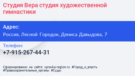 Студия Вера, студия художественной гимнастики по адресу Гусарская баллада, 7, улица Дениса Давыдова, Жилой комплекс «Гусарская баллада», ВНИИССОК, Одинцовский городской округ, Московская область, Центральный федеральный округ, 143002, Россия в дальнейшем Организация, размещена в следующих категориях: