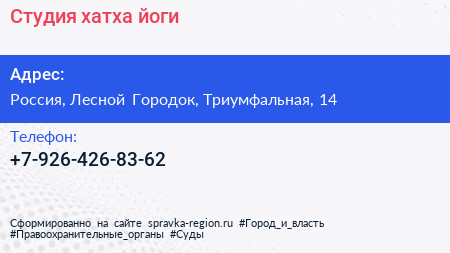 Студия хатха-йоги по адресу Магнит, 14, Триумфальная улица, Жилой комплекс «Гусарская баллада», Одинцово, Одинцовский городской округ, Московская область, Центральный федеральный округ, 143000, Россия в дальнейшем Организация, размещена в следующих категориях: