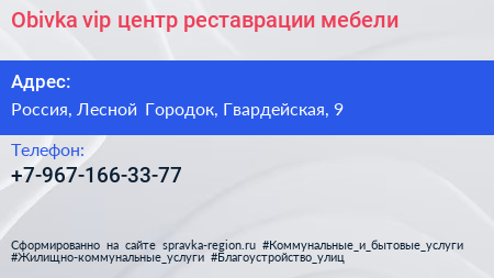 Obivka.vip, центр реставрации мебели по адресу 9, Гвардейская улица, Жилой комплекс «Гусарская баллада», Одинцово, Одинцовский городской округ, Московская область, Центральный федеральный округ, 143002, Россия в дальнейшем Организация, размещена в следующих категориях: