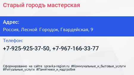 Старый городъ, мастерская по адресу 9, Гвардейская улица, Жилой комплекс «Гусарская баллада», Одинцово, Одинцовский городской округ, Московская область, Центральный федеральный округ, 143002, Россия в дальнейшем Организация, размещена в следующих категориях: