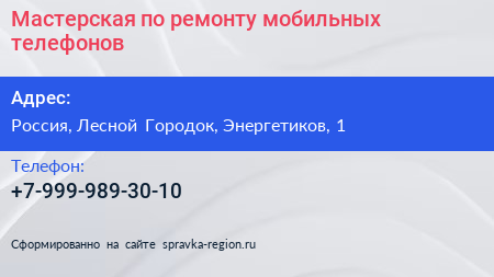 Мастерская по ремонту мобильных телефонов по адресу Торговый центр "Орешек", 1, улица Энергетиков, Лесной Городок, Одинцовский городской округ, Московская область, Центральный федеральный округ, 143080, Россия в дальнейшем Организация, размещена в следующих категориях: