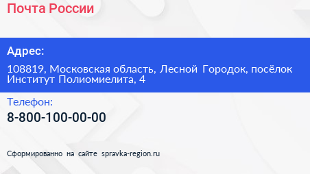 Почта России по адресу 108819, Московская область, Лесной Городок, посёлок Институт Полиомиелита, 4 в дальнейшем Организация, размещена в следующих категориях: