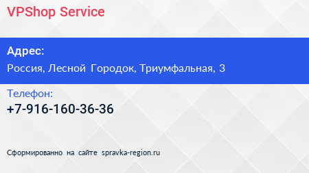 VPShop & Service по адресу 3, Триумфальная улица, Жилой комплекс «Гусарская баллада», Одинцово, Одинцовский городской округ, Московская область, Центральный федеральный округ, 143002, Россия в дальнейшем Организация, размещена в следующих категориях: