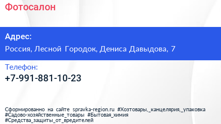 Фотосалон по адресу Гусарская баллада, 7, улица Дениса Давыдова, Жилой комплекс «Гусарская баллада», ВНИИССОК, Одинцовский городской округ, Московская область, Центральный федеральный округ, 143002, Россия в дальнейшем Организация, размещена в следующих категориях: