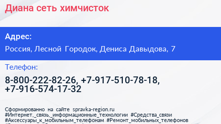 Диана, сеть химчисток по адресу Гусарская баллада, 7, улица Дениса Давыдова, Жилой комплекс «Гусарская баллада», ВНИИССОК, Одинцовский городской округ, Московская область, Центральный федеральный округ, 143002, Россия в дальнейшем Организация, размещена в следующих категориях: