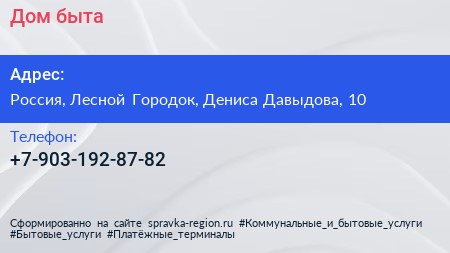 Дом быта по адресу 10, улица Дениса Давыдова, Жилой комплекс «Гусарская баллада», ВНИИССОК, Одинцовский городской округ, Московская область, Центральный федеральный округ, 143002, Россия в дальнейшем Организация, размещена в следующих категориях: