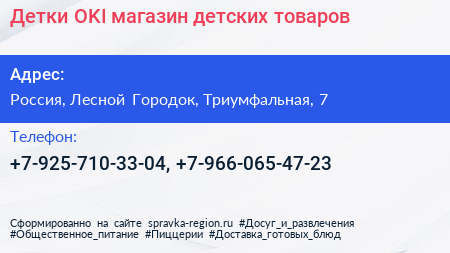 Детки-OKI, магазин детских товаров по адресу Детский сад №44, Триумфальная улица, Жилой комплекс «Гусарская баллада», Одинцово, Одинцовский городской округ, Московская область, Центральный федеральный округ, 143000, Россия в дальнейшем Организация, размещена в следующих категориях: