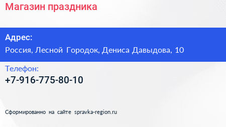 Магазин праздника по адресу 10, улица Дениса Давыдова, Жилой комплекс «Гусарская баллада», ВНИИССОК, Одинцовский городской округ, Московская область, Центральный федеральный округ, 143002, Россия в дальнейшем Организация, размещена в следующих категориях: