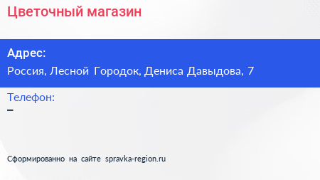 Цветочный магазин по адресу Гусарская баллада, 7, улица Дениса Давыдова, Жилой комплекс «Гусарская баллада», ВНИИССОК, Одинцовский городской округ, Московская область, Центральный федеральный округ, 143002, Россия в дальнейшем Организация, размещена в следующих категориях: