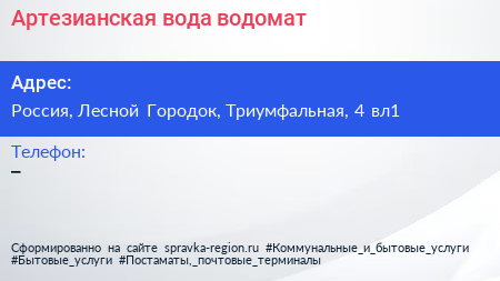Артезианская вода, водомат по адресу 4, Триумфальная улица, Жилой комплекс «Гусарская баллада», Одинцово, Одинцовский городской округ, Московская область, Центральный федеральный округ, 143000, Россия в дальнейшем Организация, размещена в следующих категориях: