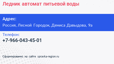 Ледник, автомат питьевой воды по адресу 9А, улица Дениса Давыдова, Жилой комплекс «Гусарская баллада», ВНИИССОК, Одинцовский городской округ, Московская область, Центральный федеральный округ, 143072, Россия в дальнейшем Организация, размещена в следующих категориях: