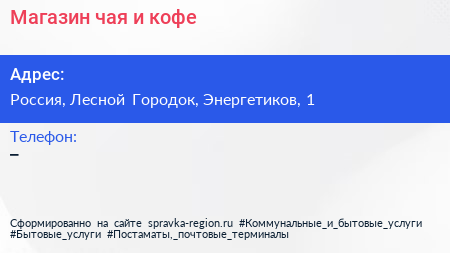 Магазин чая и кофе по адресу Торговый центр "Орешек", 1, улица Энергетиков, Лесной Городок, Одинцовский городской округ, Московская область, Центральный федеральный округ, 143080, Россия в дальнейшем Организация, размещена в следующих категориях: