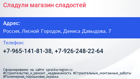 Сладули, магазин сладостей по адресу Гусарская баллада, 7, улица Дениса Давыдова, Жилой комплекс «Гусарская баллада», ВНИИССОК, Одинцовский городской округ, Московская область, Центральный федеральный округ, 143002, Россия в дальнейшем Организация, размещена в следующих категориях: