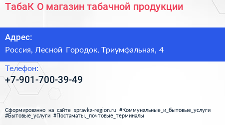 ТабаК`О, магазин табачной продукции по адресу 4, Триумфальная улица, Жилой комплекс «Гусарская баллада», Одинцово, Одинцовский городской округ, Московская область, Центральный федеральный округ, 143000, Россия в дальнейшем Организация, размещена в следующих категориях: