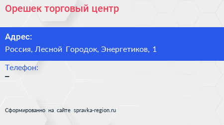 Орешек, торговый центр по адресу Торговый центр "Орешек", 1, улица Энергетиков, Лесной Городок, Одинцовский городской округ, Московская область, Центральный федеральный округ, 143080, Россия в дальнейшем Организация, размещена в следующих категориях: