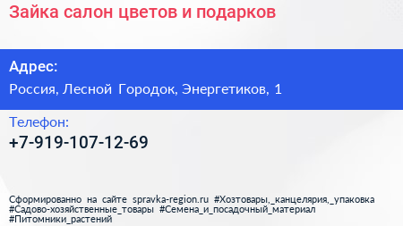 Зайка, салон цветов и подарков по адресу Торговый центр "Орешек", 1, улица Энергетиков, Лесной Городок, Одинцовский городской округ, Московская область, Центральный федеральный округ, 143080, Россия в дальнейшем Организация, размещена в следующих категориях: