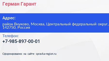 Герман Гарант по адресу район Внуково, Москва, Центральный федеральный округ, 142750, Россия в дальнейшем Организация, размещена в следующих категориях: