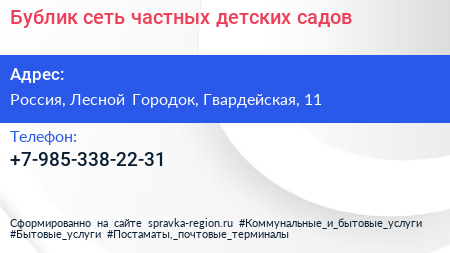 Бублик, сеть частных детских садов по адресу 11, Гвардейская улица, Жилой комплекс «Гусарская баллада», Одинцово, Одинцовский городской округ, Московская область, Центральный федеральный округ, 143002, Россия в дальнейшем Организация, размещена в следующих категориях: