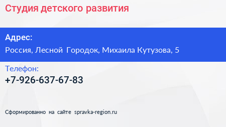 Студия детского развития по адресу 5, улица Михаила Кутузова, Жилой комплекс «Гусарская баллада», ВНИИССОК, Одинцовский городской округ, Московская область, Центральный федеральный округ, 143072, Россия в дальнейшем Организация, размещена в следующих категориях:
