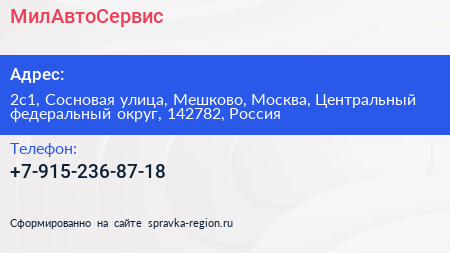 МилАвтоСервис по адресу 2с1, Сосновая улица, Мешково, Москва, Центральный федеральный округ, 142782, Россия в дальнейшем Организация, размещена в следующих категориях: