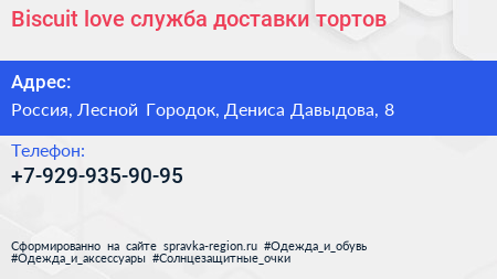 Biscuit-love, служба доставки тортов по адресу 8, улица Дениса Давыдова, Жилой комплекс «Гусарская баллада», ВНИИССОК, Одинцовский городской округ, Московская область, Центральный федеральный округ, 143002, Россия в дальнейшем Организация, размещена в следующих категориях:
