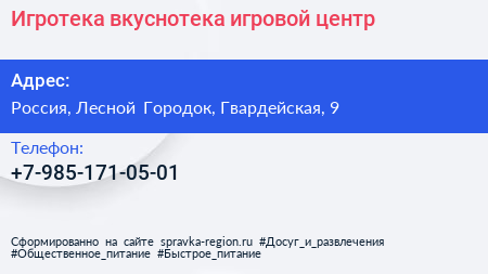 Игротека-вкуснотека, игровой центр по адресу 9, Гвардейская улица, Жилой комплекс «Гусарская баллада», Одинцово, Одинцовский городской округ, Московская область, Центральный федеральный округ, 143002, Россия в дальнейшем Организация, размещена в следующих категориях: