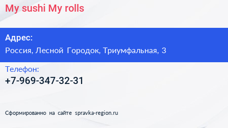 My sushi My rolls по адресу 3, Триумфальная улица, Жилой комплекс «Гусарская баллада», Одинцово, Одинцовский городской округ, Московская область, Центральный федеральный округ, 143002, Россия в дальнейшем Организация, размещена в следующих категориях: