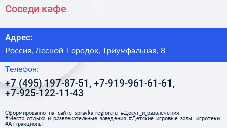 Соседи, кафе по адресу 8, Триумфальная улица, Жилой комплекс «Гусарская баллада», Одинцово, Одинцовский городской округ, Московская область, Центральный федеральный округ, 143002, Россия в дальнейшем Организация, размещена в следующих категориях: