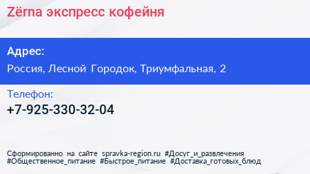 Zёrna, экспресс-кофейня по адресу 2, Триумфальная улица, Жилой комплекс «Гусарская баллада», Одинцово, Одинцовский городской округ, Московская область, Центральный федеральный округ, 143000, Россия в дальнейшем Организация, размещена в следующих категориях: