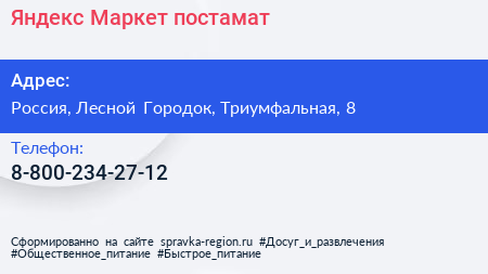 Яндекс.Маркет, постамат по адресу 8, Триумфальная улица, Жилой комплекс «Гусарская баллада», Одинцово, Одинцовский городской округ, Московская область, Центральный федеральный округ, 143002, Россия в дальнейшем Организация, размещена в следующих категориях: