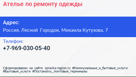 Ателье по ремонту одежды по адресу 7, улица Михаила Кутузова, Жилой комплекс «Гусарская баллада», ВНИИССОК, Одинцовский городской округ, Московская область, Центральный федеральный округ, 143072, Россия в дальнейшем Организация, размещена в следующих категориях: