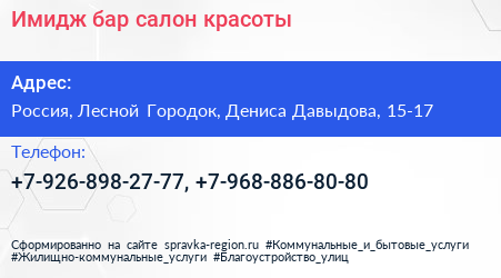 Имидж бар, салон красоты по адресу 15-17, улица Дениса Давыдова, Жилой комплекс «Гусарская баллада», ВНИИССОК, Одинцовский городской округ, Московская область, Центральный федеральный округ, 143002, Россия в дальнейшем Организация, размещена в следующих категориях: