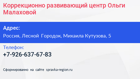 Коррекционно-развивающий центр Ольги Малаховой по адресу 5, улица Михаила Кутузова, Жилой комплекс «Гусарская баллада», ВНИИССОК, Одинцовский городской округ, Московская область, Центральный федеральный округ, 143072, Россия в дальнейшем Организация, размещена в следующих категориях: