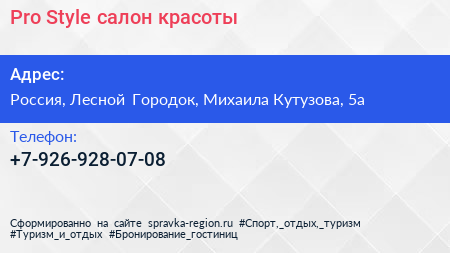Pro Style, салон красоты по адресу Промсвязьбанк, 5А, улица Михаила Кутузова, Жилой комплекс «Гусарская баллада», ВНИИССОК, Одинцовский городской округ, Московская область, Центральный федеральный округ, 143072, Россия в дальнейшем Организация, размещена в следующих категориях: