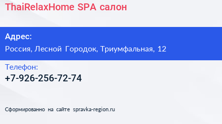 ThaiRelaxHome, SPA-салон по адресу 12, Триумфальная улица, Жилой комплекс «Гусарская баллада», Одинцово, Одинцовский городской округ, Московская область, Центральный федеральный округ, 143000, Россия в дальнейшем Организация, размещена в следующих категориях: