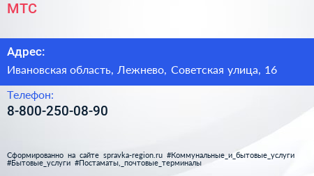 МТС по адресу Ивановская область, Лежнево, Советская улица, 16 в дальнейшем Организация, размещена в следующих категориях: