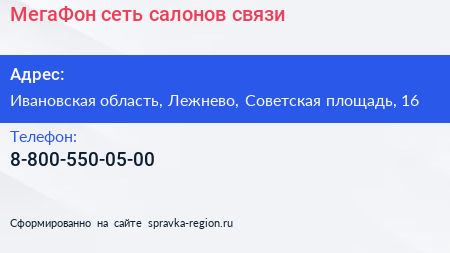 МегаФон, сеть салонов связи по адресу Ивановская область, Лежнево, Советская площадь, 16 в дальнейшем Организация, размещена в следующих категориях:
