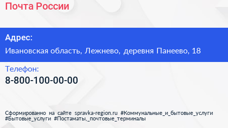 Почта России по адресу Ивановская область, Лежнево, деревня Панеево, 18 в дальнейшем Организация, размещена в следующих категориях: