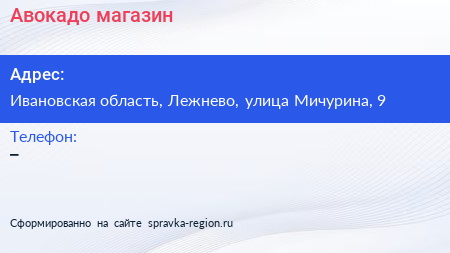 Авокадо, магазин по адресу Ивановская область, Лежнево, улица Мичурина, 9 в дальнейшем Организация, размещена в следующих категориях: