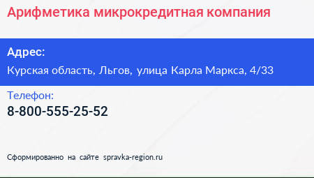 Арифметика, микрокредитная компания по адресу Курская область, Льгов, улица Карла Маркса, 4/33 в дальнейшем Организация, размещена в следующих категориях: