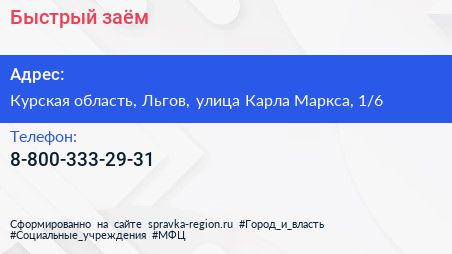Быстрый заём по адресу Курская область, Льгов, улица Карла Маркса, 1/6 в дальнейшем Организация, размещена в следующих категориях: