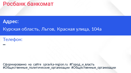 Росбанк, банкомат по адресу Курская область, Льгов, Красная улица, 104а в дальнейшем Организация, размещена в следующих категориях: