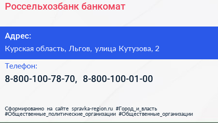 Россельхозбанк, банкомат по адресу Курская область, Льгов, улица Кутузова, 2 в дальнейшем Организация, размещена в следующих категориях: