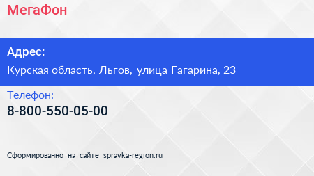 МегаФон по адресу Курская область, Льгов, улица Гагарина, 23 в дальнейшем Организация, размещена в следующих категориях: