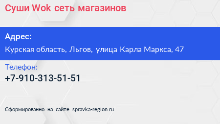 Суши Wok, сеть магазинов по адресу Курская область, Льгов, улица Карла Маркса, 47 в дальнейшем Организация, размещена в следующих категориях: