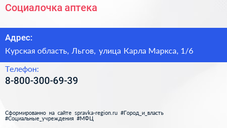Социалочка, аптека по адресу Курская область, Льгов, улица Карла Маркса, 1/6 в дальнейшем Организация, размещена в следующих категориях: