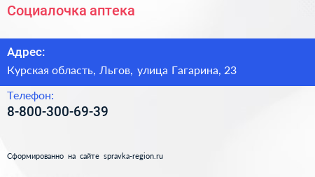 Социалочка, аптека по адресу Курская область, Льгов, улица Гагарина, 23 в дальнейшем Организация, размещена в следующих категориях: