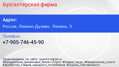 Бухгалтерская фирма по адресу Торговый дом "Дулёво", 9, Коммунистическая улица, Ликино-Дулёво, Орехово-Зуевский городской округ, Московская область, Центральный федеральный округ, 142670, Россия в дальнейшем Организация, размещена в следующих категориях: